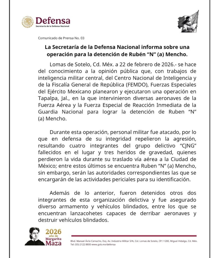 La Secretaria de la Defensa Nacional confirmó la muerte de Nemesio Oseguera Cervantes, alias el “Mencho”, líder del Cártel Jalisco Nueva Generación (CJNG), durante un operativo realizado la mañana de este domingo en Tapalpa, Jalisco.