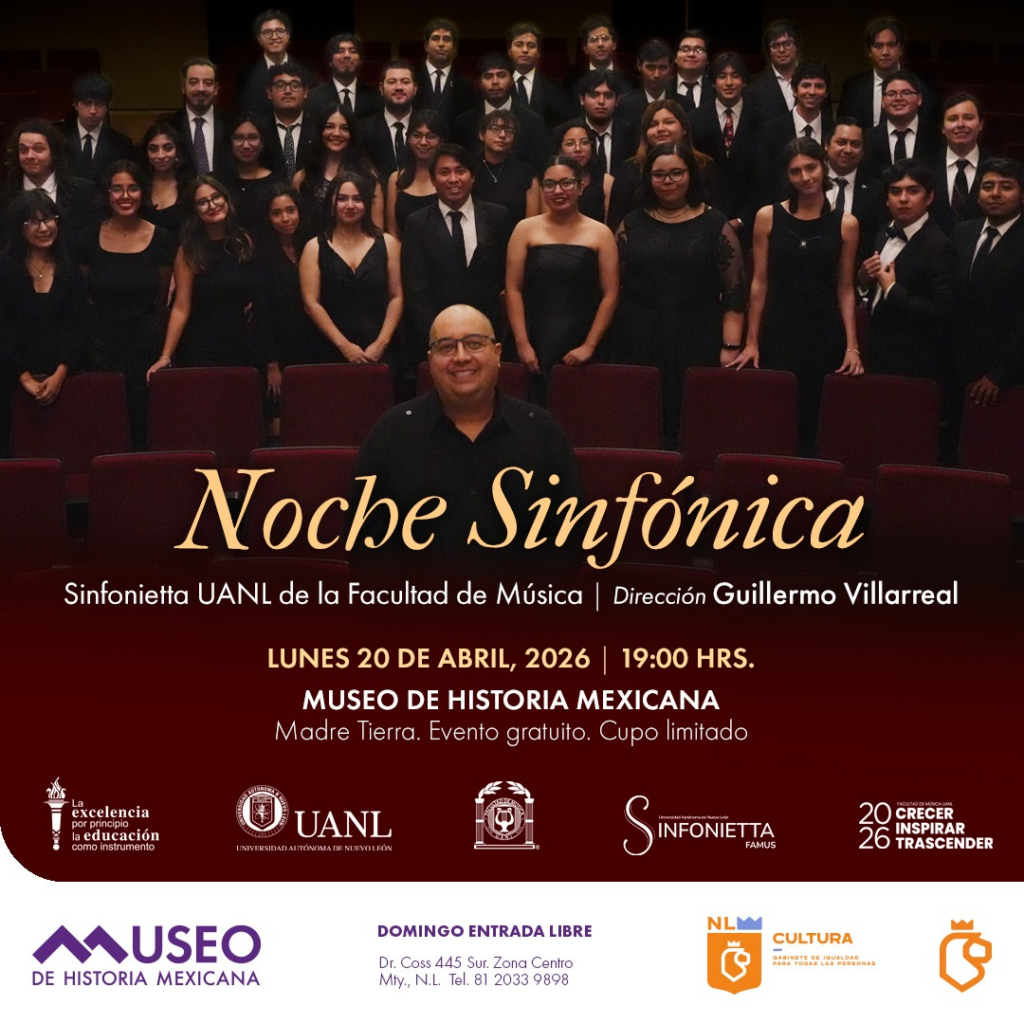 El Museo de Historia Mexicana y la Facultad de Música de la Universidad Autónoma de Nuevo León invita al público a disfrutar de una “Noche sinfónica”, con la actuación de la Sinfonietta UANL de la Facultad de Música, con un programa de gran riqueza expresiva y diversidad estilística, bajo la dirección de Guillermo Villarreal, el lunes 20 de abril de 2026 a las 20:00 horas.