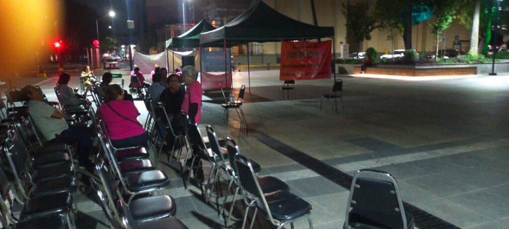 Por turnos escalonados de dos horas, cientos de maestros retirados participan en la protesta desde las 10 de la mañana, e incluso varios que quedaron a pernoctar. El plantón continuará este martes hasta las 4 de la tarde.